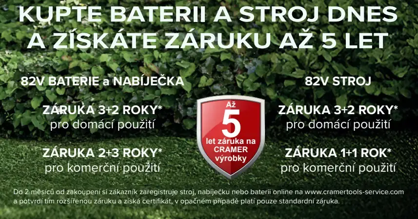- Záruka pro domácí využití: na stroj, nabíječku a baterii je standardní záruka 3 roky. Do 2 měsíců od zakoupení si zákazník může zaregistovat stroj, nabíječku nebo baterii online na www.cramertools-service.com a tím získá rozšířenou záruku na 5 let a certifikát.