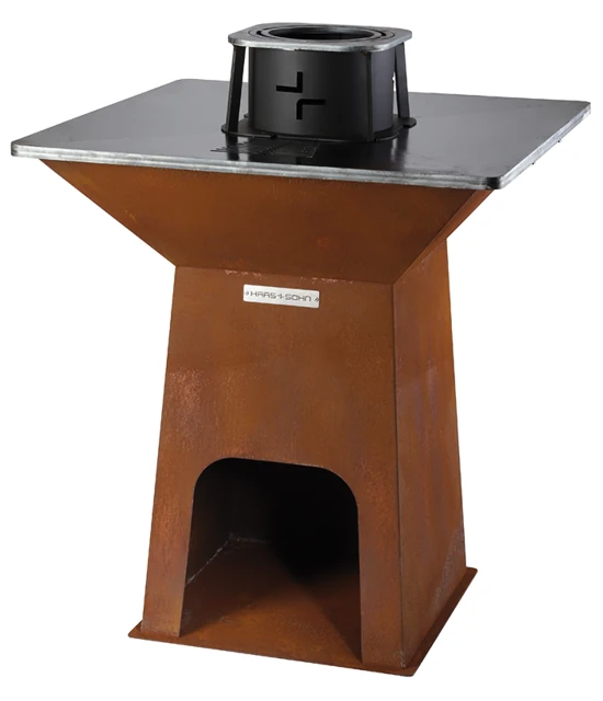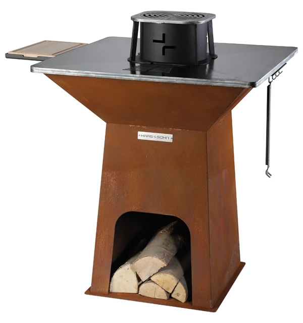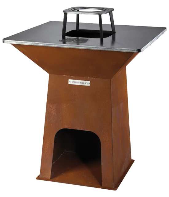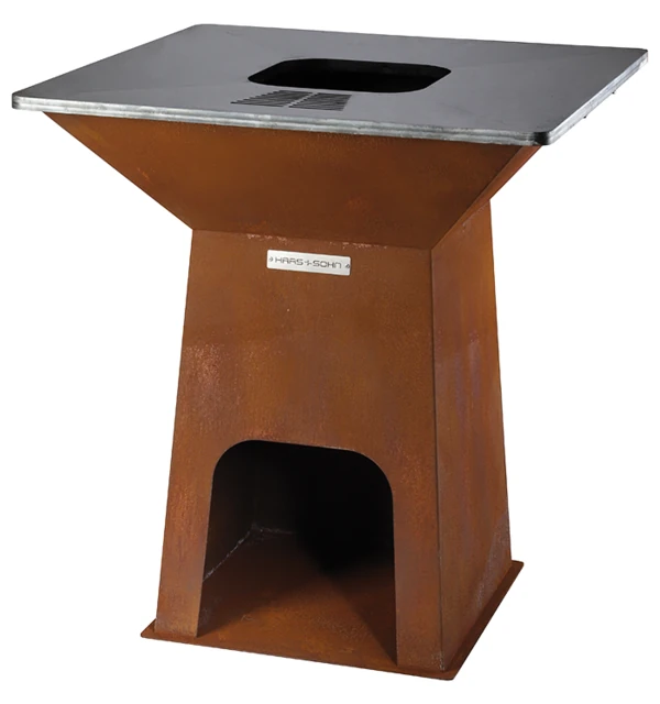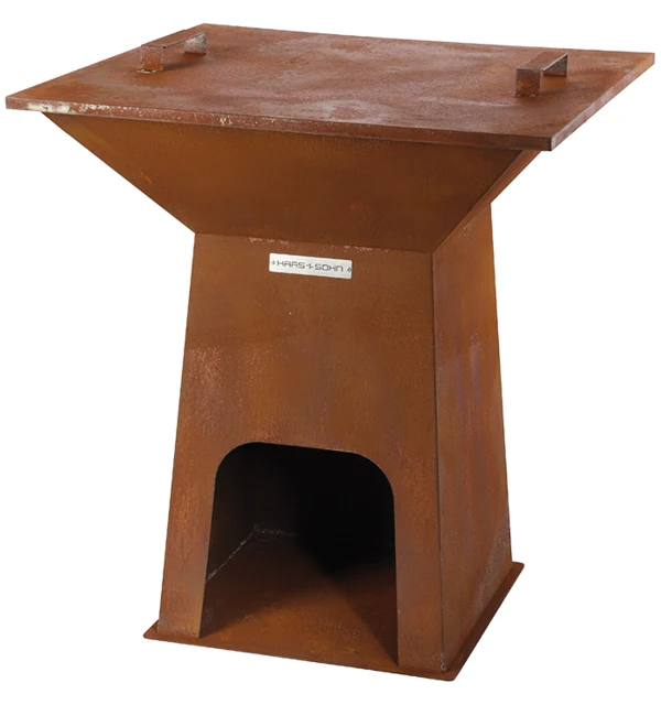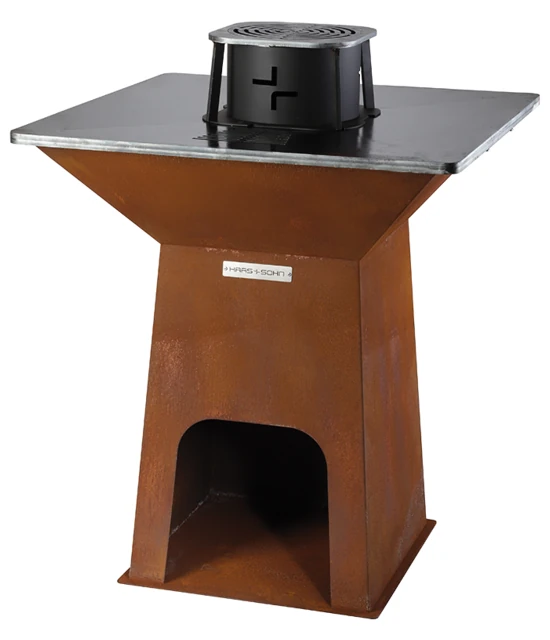 Kovový gril z patinující Cortenové oceli je opatřen masivní ocelovou plancha deskou (rozměr 850 x 850 mm).