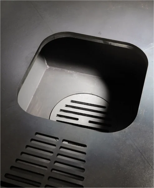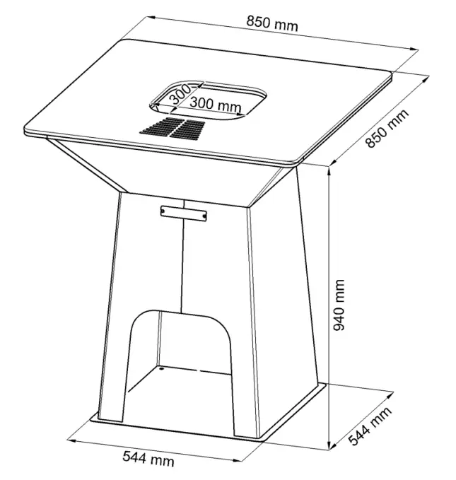 Grilovací deska je prolomená do středu, což brání stékání tuku mimo gril.Přívod vzduchu do topeniště je zespodu.Pod roštem je objemný vyjímatený popelník.V podstavci grilu je prostor pro uložení dřeva nebo příslušenství grilu.Upozornění: Výrobek není určen pro styk s kyselými potravinami!