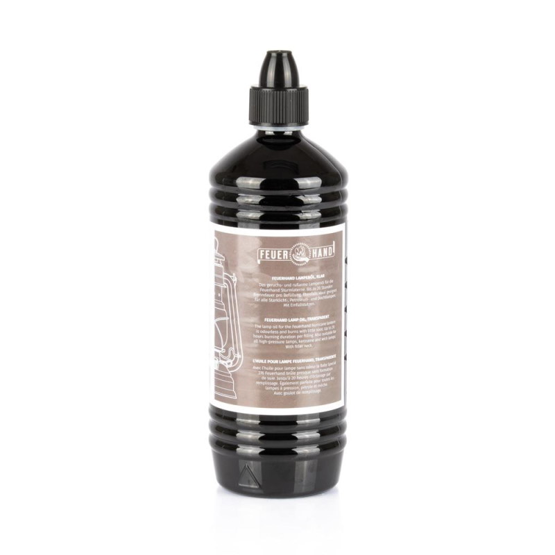 Vysoce kvalitní bezbarvé kapalné palivo, které při provozu petrolejových lamp Feuerhand zajišťuje spalování bez zápachu a sazí. Lampový olej se vyznačuje zejména vysokou čistotou paliva. Připojené plnicí hrdlo umožňuje plnění petrolejové lampy bez odkapávání. V případě potřeby lze plnící hrdlo snadno odmontovat.