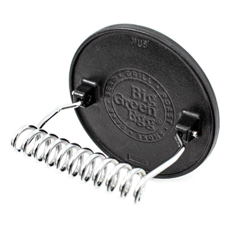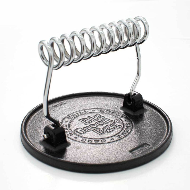 Litinový lis od Big Green Egg na smash burger. Lis zajistí, že burger bude na povrchu pěkně křupavý a uvnitř zůstane lahodně šťavnatý.