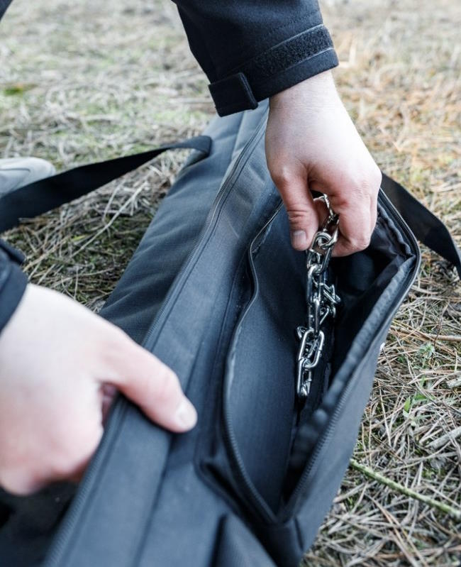 Transportní obal na trojnožku pro vaření na ohni vyrobená z odolné ripstopové tkaniny.