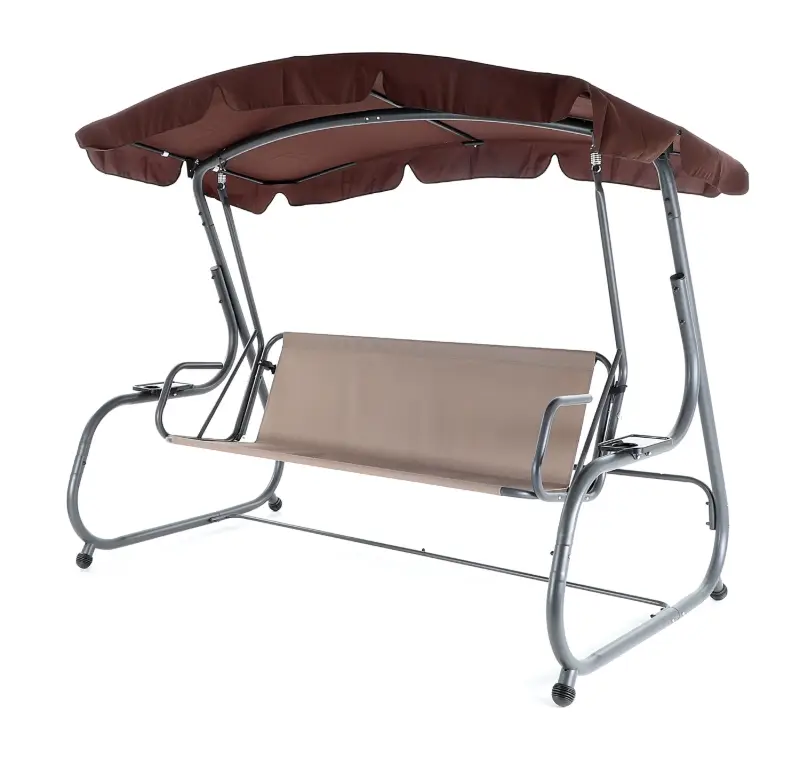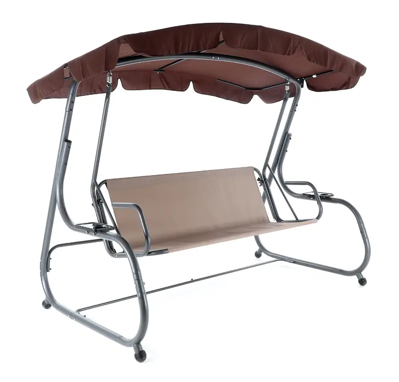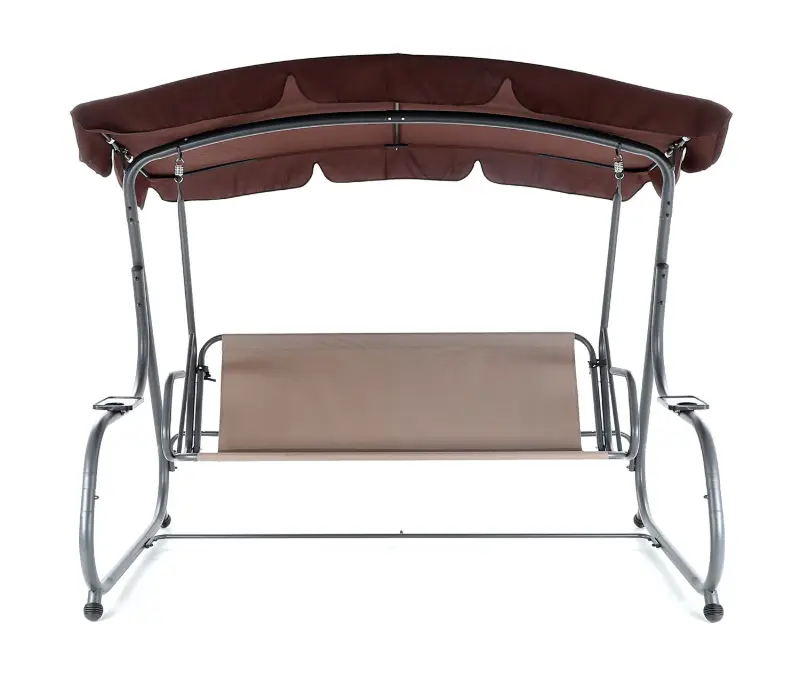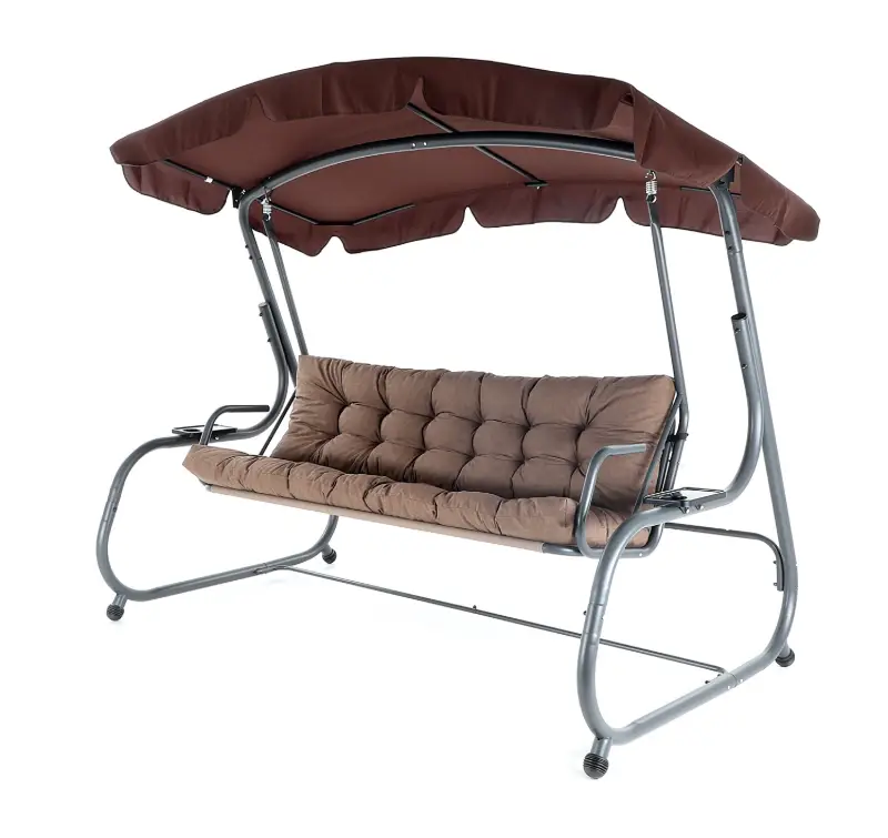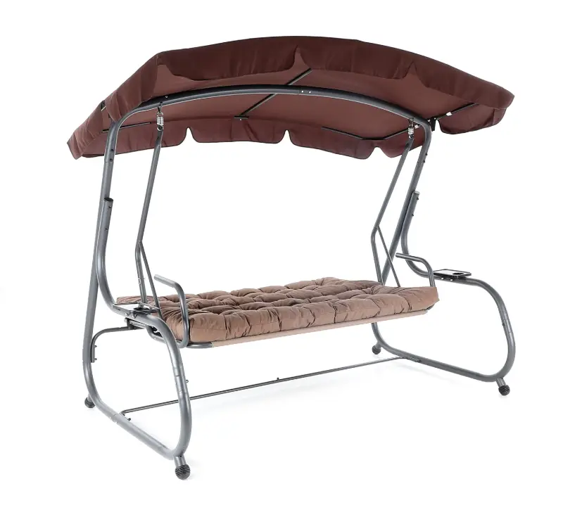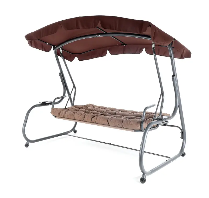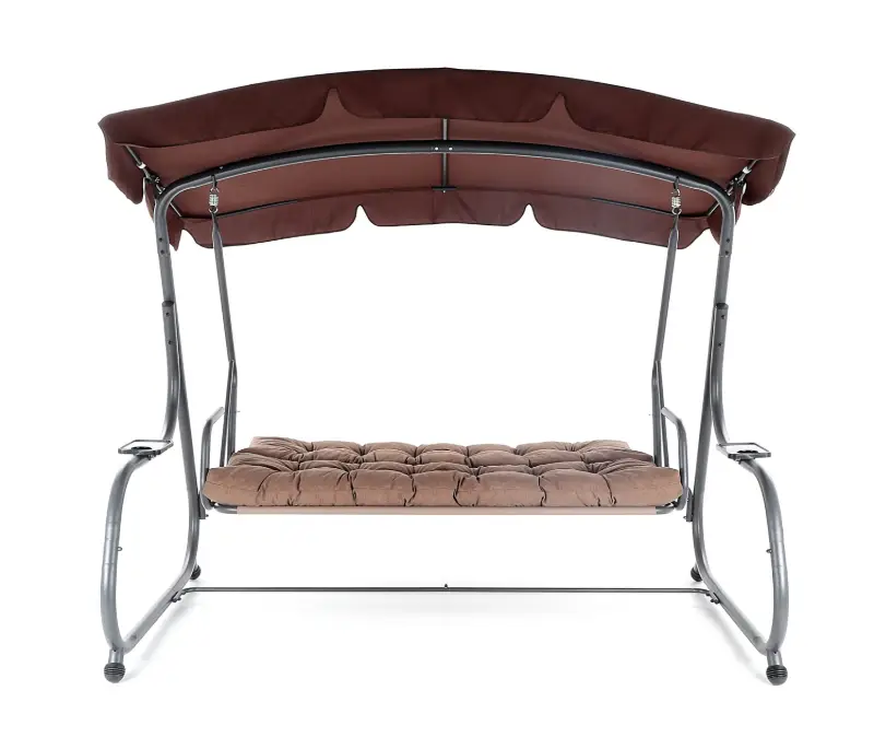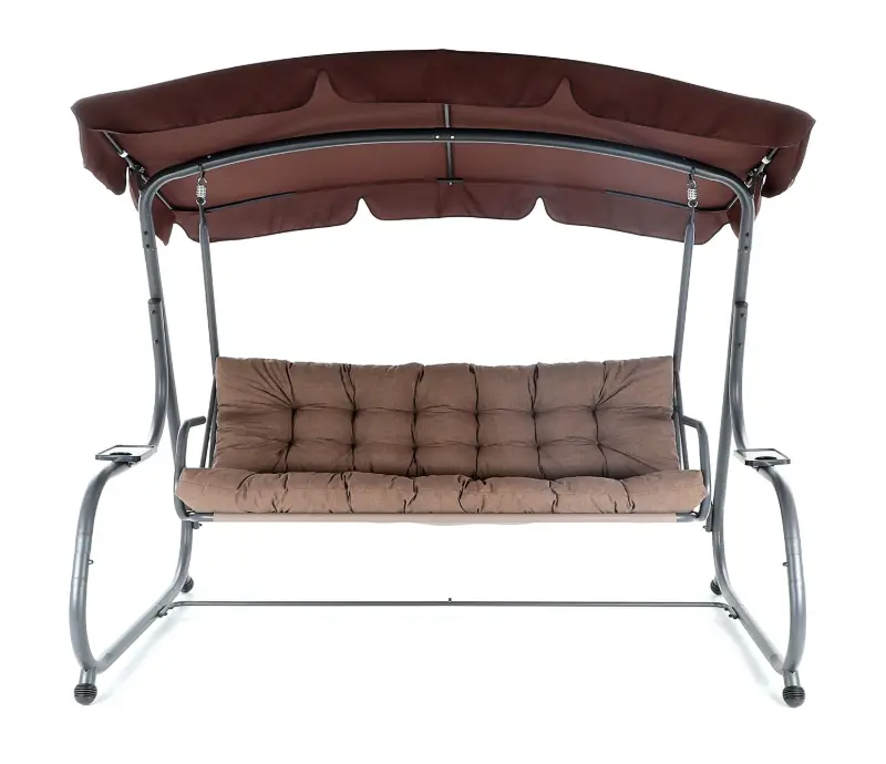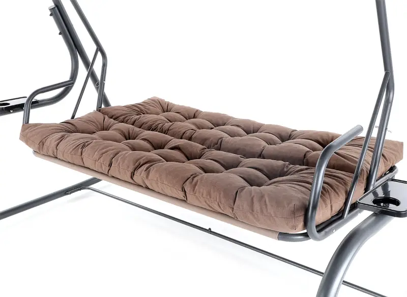 Zahradní třímístná houpačka s čalouněním. Při výrobě je použit speciálně upravený ocelový materiál o průměru trubek 48 mm pro vysokou tuhost. Povrchová úprava nábytku je provedena komaxitovou barvou. Masivní čalounění s podhlavníky plně dokresluje charakter pohodlné luxusní houpačky pro ty nejnáročnější uživatelé. Jako speciální nadstandardní výbava je úprava houpačky do lůžkové úpravy, která se provede jednoduchou fixací podsedáku s opěradlem.