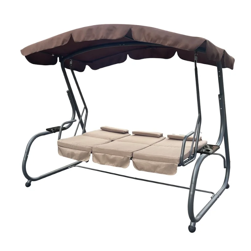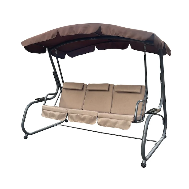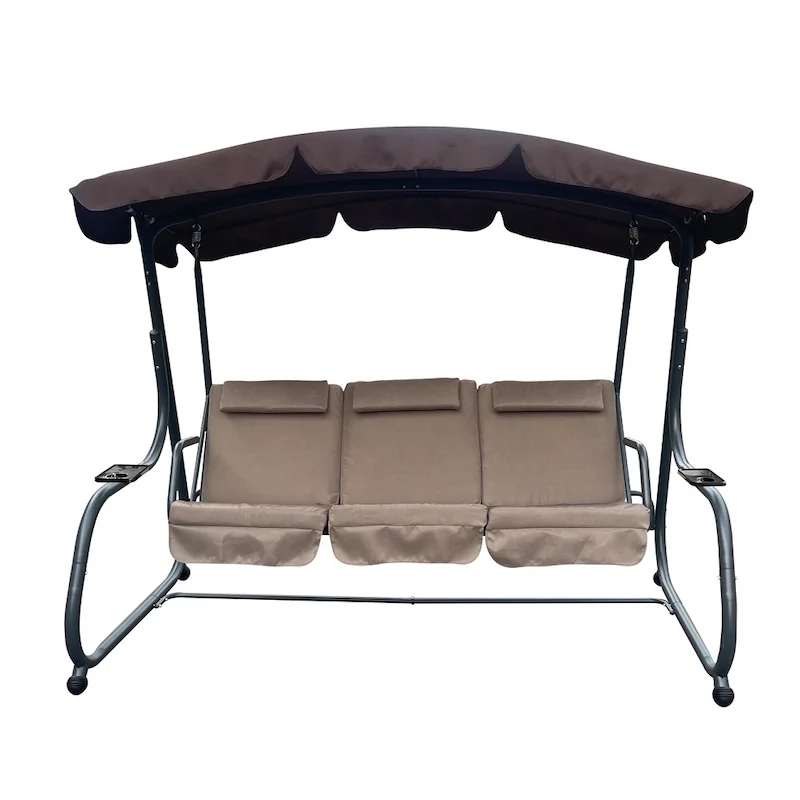 Zahradní třímístná houpačka s čalouněním. Při výrobě je použit speciálně upravený ocelový materiál o průměru trubek 48 mm pro vysokou tuhost. Povrchová úprava nábytku je provedena komaxitovou barvou.