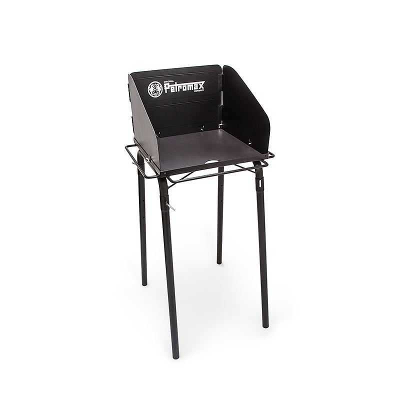 Stoly Petromax nabízejí bezpečný stojan a varnou plochu s pohodlnou pracovní výškou 87 cm. Alternativně lze nohy odstranit a umístit stůl na jakýkoli podklad. Ochranné zástěny šetří energii a uhlí při vaření za větrného počasí. Přední a boční úchytky nabízí možnost zavěšení kleští na dřevěné uhlí, utěrek nebo grilovacích rukavic. Při čištění stolu lze zbytky popela a uhlí jednoduše vymetat otvorem v přední části pracovní plochy.
