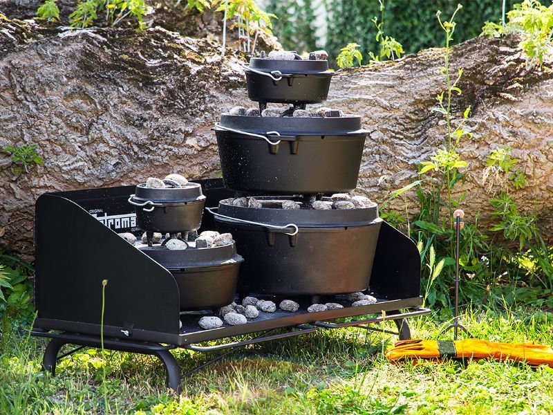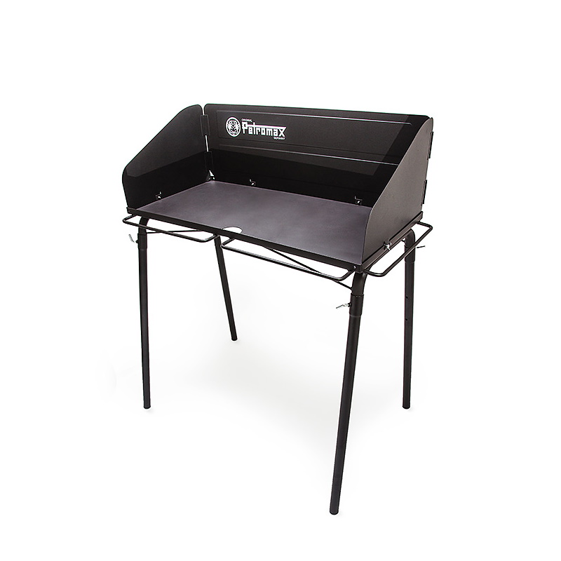 Stoly Petromax nabízejí bezpečný stojan a varnou plochu s pohodlnou pracovní výškou 87 cm. Alternativně lze nohy odstranit a umístit stůl na jakýkoli podklad. Ochranné zástěny šetří energii a uhlí při vaření za větrného počasí. Přední a boční úchytky nabízí možnost zavěšení kleští na dřevěné uhlí, utěrek nebo grilovacích rukavic. Při čištění stolu lze zbytky popela a uhlí jednoduše vymetat otvorem v přední části pracovní plochy.
