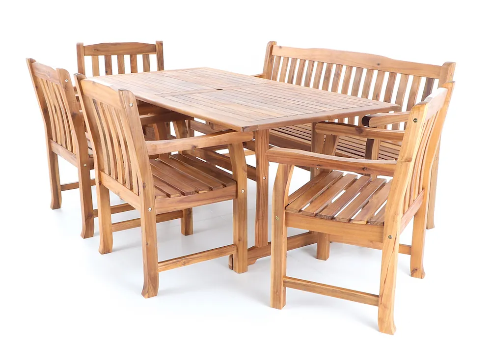 Luxusní stolová sestava 4 křesel, 1 lavice a stolu z exoticky velice trvanlivého a tvrdého dřeva Akácia. Tato dřevina na první pohled upoutá svou atraktivní medovou barvou a unikátní kresbou dřeva. TUVALU VeGA set 7 DeLuxe patří do značkové kolekce vyrobené z nejkvalitnější světlého dřeva AKÁCIE o hustotě okolo 650 kg/m3. Nábytek je povrchově upraven bezbarvým teakovým olejem.