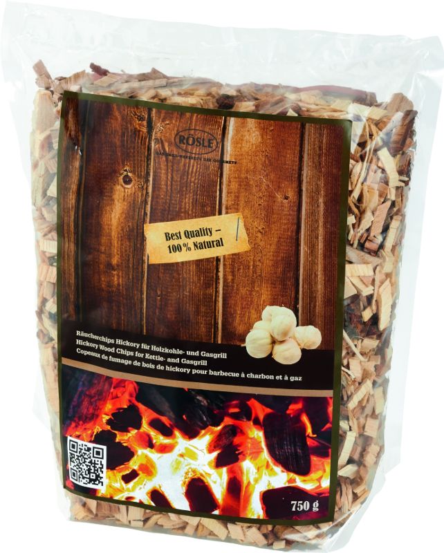 Aromatické lupínky na uzení z přírodního dřeva Hickory (ořech): uzené aroma vhodné pro uzení zvěřiny, hovězího masa, drůbeže a sýra.