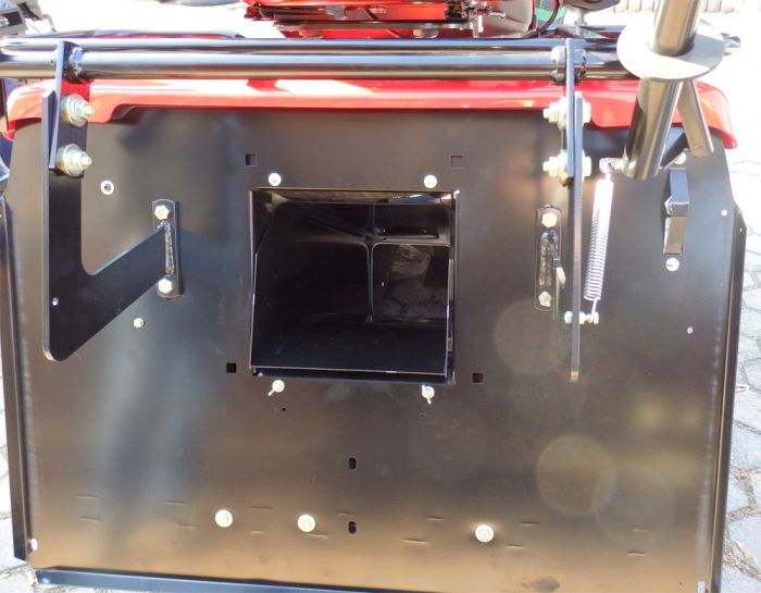 Výhozový otvor který se neucpává - šířka odhozového tunelu je 250x250 mm, tímto výrazně zamezuje nepříjemnému ucpávání při sečení vysoké nebo mokré trávy.