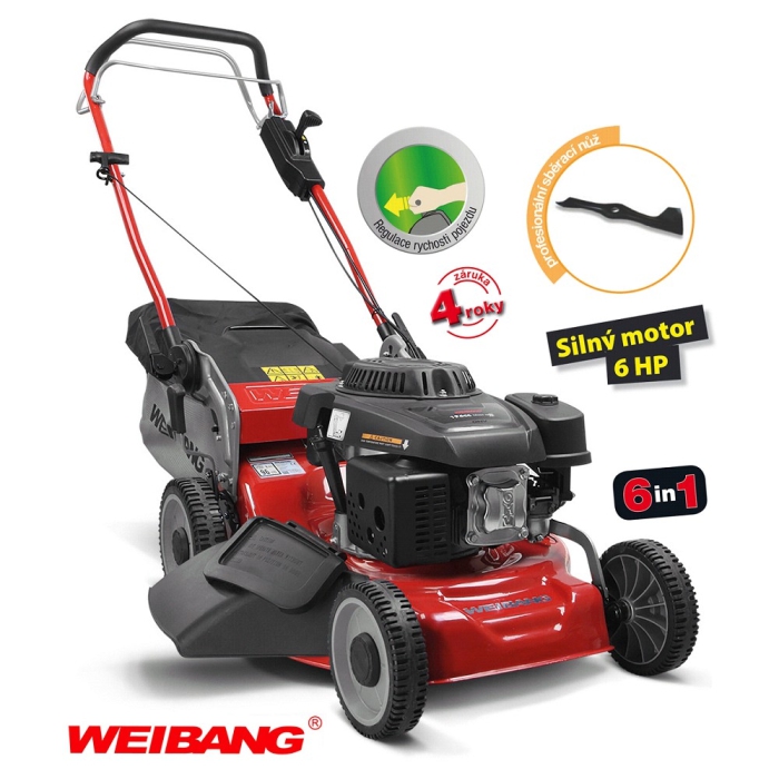 Sekačka je určena na menší až středně velké travnaté plochy. Vyniká speciálním pevným a masivním ocelovým šasim, které má speciální metalický komaxitový nástřik SMOOTH HARDNESS (3 vrstvy nástřiku). Velkou předností této sekačky je variabilnost použití funkcí 6in1. Výhoda silného motoru s rozvodem OHV o výkonu 6HP a nože s velkými lopatami (BIG BLADE) Vám perfektně seberou i přerostlou mokrou trávu. Jedná se o profeisonální silný motor rozvodu OHV o výkonu 6 HP a vysokým kroutícím momentem 8,9 Nm - 159 ccm. Velkou výhodou tohoto motoru je automatický sytič, tzn. že sekačku nastartujete kdyko-li a kdoko-li bez nutnosti cokoli na sekačce či motoru nastavovat.
